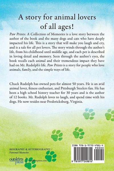 Paw Prints: A Collection of Memories is a love story between the author of the book and the many dogs and cats who have deeply impacted his life. This is a story that will make you laugh and cry, and is a tale for all pet lovers. The story winds through the author's life, from his childhood until middle age, and each pet is described in loving detail and memory. Seen through the author's eyes, the book recalls each animal and their tremendous impact they have had on Mr. Rudolph's life. Paw Prints is a story for people who love animals, family, and the simple ways of life.