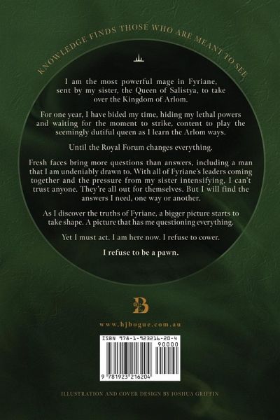 Knowledge finds those who are meant to see. I am the most powerful mage in Fyriane, sent by my sister, the Queen of Salistya, to take over the Kingdom of Arlom. For one year, I have bided my time, hiding my lethal powers and waiting for the moment to strike, content to play the seemingly dutiful queen as I learn the Arlom ways. Until the Royal Forum changes everything. Fresh faces bring more questions than answers, including a man that I am undeniably drawn to. With all of Fyriane's leaders coming together and the pressure from my sister intensifying, I can't trust anyone. They're all out for themselves. But I will find the answers I need, one way or another. As I discover the truths of Fyriane, a bigger picture starts to take shape. A picture that has me questioning everything. Yet I must act. I am here now. I refuse to cower. I refuse to be a pawn.