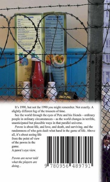 It's 1990, but not the 1990 you might remember. Not exactly. A slightly different leg of the trousers of time. See the world through the eyes of Pete and his friends - ordinary people in ordinary circumstances - as the world changes in terrible, unanticipated but plausible ways in that parallel universe. Pawns is about life, and love, and death, and surviving, and the randomness of who gets dealt what hand in the game of life. Above all, it's about seeing life from the point of view of the pawns in the game. A pawn's eye view. Pawns are never told what the players are doing...