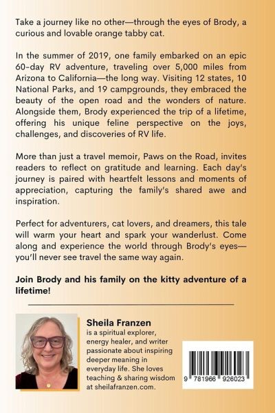 Ever wondered what it's like to embark on a cross-country RV adventure with your family - and your cat? Imagine discovering America's most breathtaking landscapes through the curious eyes of a feline companion, offering a unique perspective on family bonds, natural wonders, and the art of embracing the unexpected. In this heartwarming memoir, Sheila Franzen and her family, including their beloved cat Brody, set out on an extraordinary 60-day journey across 12 states and 10 national parks. From the Painted Desert of Arizona to the towering sequoias of California, their adventure unfolds through the unique perspective of their four-legged travel companion. As an experienced traveler and devoted mother, Sheila masterfully weaves together tales of family bonding, natural wonders, and the challenges of RV living, all seen through Brody's perceptive feline eyes. This isn't just another travel memoir - it's a testament to family resilience, adaptability, and the magic that happens when we step out of our comfort zones together. 'Paws on the Road' is more than just a travel story - it's your guide to creating unforgettable family memories while exploring America's most stunning landscapes. Through Brody's eyes, you'll gain a fresh perspective on family dynamics, adventure, and the art of living in the moment. Pick up 'Paws on the Road' today and embark on your own journey of family discovery and adventure!