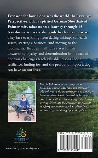 This heartwarming memoir told from the perspective of a special shelter dog, Ella, offers 40 insightful lessons on overcoming challenges, being your authentic self, and pursuing your passions. In their 15 years together, Ella and Carrie face everything from dating mishaps to health scares, starting a business, and moving to the mountains. Through it all, Ella's zest for life, unwavering loyalty, and determination in the face of her own challenges with degenerative myelopathy teach valuable lessons about resilience, finding joy, and the profound impact a dog can have on our lives. Pawsitive Perspectives is a love story, a manual for living life to the fullest, and an example of the transformative human-animal bond.