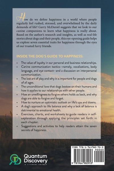 How do we define happiness in a world where people regularly feel rushed, stressed, and overwhelmed by the daily demands of life? Garry McDaniel suggests that we look to our canine companions to learn what happiness is really about. Based on the author's research and insights, as well as real-life stories about dogs and their people, this eye-opening guide helps us explore seven essential traits for happiness through the eyes of our trusted furry friends.Inside The Dog's Guide to Happiness:The value of loyalty in our personal and business relationships. Canine communication tactics-namely, vocalizations, body language, and eye contact-and a discussion on interpersonal communication. The lost art of play and why it is important for people and dogs of all ages. The unconditional love that dogs bestow on their humans and how it applies to our relationships with other people. How an unwillingness to forgive others holds us back, and why dogs are able to forgive and forget. How to nurture an optimistic outlook on life's ups and downs. A dog's approach to life balance and why a lack of balance is detrimental to emotional health. Exercises, charts, and worksheets to guide readers in self-exploration through applying the principles set forth in each chapter. Suggestions and activities to help readers attain the seven secrets of happiness.