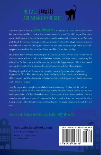 Not all secrets are meant to be kept. After two stressful months, Amber Blackwood is determined to have a few weeks of peace before the Here and Meow Festival descends on her small town of Edgehill, Oregon. That peace doesn’t last long; when she and the committee attend a meeting at the mayor’s house, Amber is pulled aside by the mayor’s daughter, Chloe, who Amber babysat for in high school. The mayor has forbidden Chloe from dating, but she recently met an older boy through a chat app and is desperate to meet him. Amber advises Chloe to tell her father about the boy. Hours later, Mayor Deidrick frantically puts in a call to Amber: Chloe, the always well-behaved teenager, seems to have snuck out her bedroom window—and now she’s not answering his calls. When Amber helps search the town for the girl, she happens upon Chloe’s abandoned car. Her driver’s side door is open, and while her purse is inside, her phone is gone. Working alongside Chief Brown, Amber uses her magic to figure out what might have happened to Chloe. The more they dig, the more they unearth secrets from the seemingly affable mayor’s past. The charismatic politician has both a hair-trigger temper and a suspicious death linked to his past. As if the mayor’s increasingly strange behavior isn’t bad enough, Amber and the chief also contend with an out-of-town private investigator, nosy reporter Connor Declan, and an even nosier population of Edgehill residents who start to question why Amber and the chief are spending so much time together. Undaunted by these obstacles, Amber races against the clock to help ensure Chloe doesn’t become another statistic—assuming the mayor doesn’t stop her first.