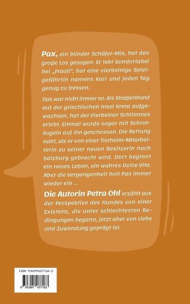 Pax, ein blinder Schäfer-Mix, hat das große Los gezogen. Er lebt komfortabel bei "Frauli", hat eine vierbeinige Spielgefährtin namens Kari und jeden Tag genug zu fressen.Das war nicht immer so. Als Straßenhund auf der griechischen Insel Kreta aufgewachsen, hat der Vierbeiner Schlimmes erlebt. Einmal wurde sogar mit Schrotkugeln auf ihn geschossen. Die Rettung naht, als er von einer Tierheim-Mitarbeiterin zu seiner neuen Besitzerin nach Salzburg gebracht wird. Dort beginnt ein neues Leben, ein wahres Dolce Vita. Aber die Vergangenheit holt Pax immer wieder ein ...Die Autorin Petra Ohl erzählt aus der Perspektive des Hundes von einer Existenz, die unter schlechtesten Bedingungen begann, jetzt aber von Liebe und Zuwendung geprägt ist.