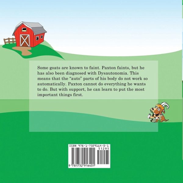 Some goats are known to faint. Paxton faints, but he has also been diagnosed with Dysautonomia. This means that the "auto" parts of his body do not work so automatically. Paxton cannot do everything he wants to do. But with support, he can learn to put the most important things first. Paxton's story can be used by parents, teachers or counselors to open dialogue about challenging assumptions. Further material can be found at www.donkeypenguin.com. Paxton is a goat, different from the other farm animals. Some of the animals will never understand him, while others happily help him. No matter what, he must remember to love himself. The final pages provide a simplified explanation of Dysautonomia along with some of the common symptoms. Paxton's story delivers a healthy message for readers of all ages, childhood through adult, who struggle or know someone with an invisible illness.