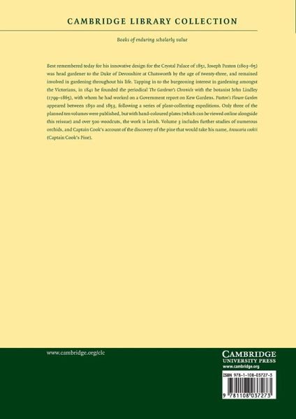 Best remembered today for his innovative design for the Crystal Palace of 1851, Joseph Paxton (1803-65) was head gardener to the Duke of Devonshire at Chatsworth by the age of twenty-three, and remained involved in gardening throughout his life. Tapping in to the burgeoning interest in gardening amongst the Victorians, in 1841 he founded the periodical The Gardener's Chronicle with the botanist John Lindley (1799-1865), with whom he had worked on a Government report on Kew Gardens. Paxton's Flower Garden appeared between 1850 and 1853, following a series of plant-collecting expeditions. Only three of the planned ten volumes were published, but with hand-coloured plates (which can be viewed online alongside this reissue) and over 500 woodcuts, the work is lavish. Volume 3 includes further studies of numerous orchids, and Captain Cook's account of the discovery of the pine that would take his name, Araucaria cookii (Captain Cook's Pine).