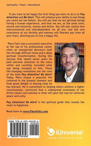 If you want to be happy the first thing you have to do is to Pay Attention and Be Alert. This will enhance your ability to see things you could not see before. You will become aware that we are spiritual beings having a human experience, and that we are, at the same time, mortal and immortal, impermanent and everlasting, human and divine. You will become conscious that we all are interconnected and interdependent, and this new conscience of our divinity and oneness will liberate you from all your fears, allowing you to live a happy life. Piero Falci was living the life of his dreams when an unexpected downturn took him through difficult times and a deep spiritual transformation. During this journey that lasted seven years he paid extreme attention to the voice within and faithfully recorded what was being revealed to him. Those life-changing revelations are the core of the book Pay Attention! Be Alert! Today, Piero enjoys a peaceful life centered in the present moment and finds great delight in sharing what he has learned. He is committed to helping others achieve a higher consciousness, convinced that a widespread awareness of our divine nature and oneness is what will pave the way for universal peace and unity. Pay Attention! Be Alert! is the spiritual guide that reveals the route to happiness.