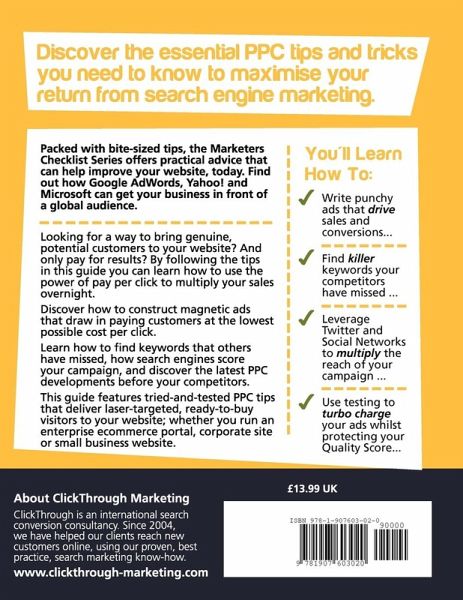 Looking for a way to bring genuine, potential customers to your website? And only pay for results? By following the tips in this guide you can learn how to use the power of pay per click to multiply your sales overnight. Discover how to construct magnetic ads that draw in paying customers at the lowest possible cost per click. Learn how to find keywords that others have missed, how search engines score your campaign, and discover the latest PPC developments before your competitors. Packed with bite-sized tips, the Marketers Checklist Series offer practical advice that can help improve your website, today. Find out how Google AdWords, Yahoo! and Microsoft can get your business in front of a global audience.