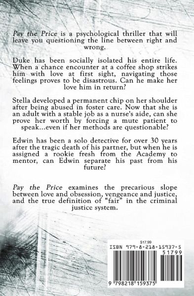 Pay the Price is a psychological thriller that will leave you questioning the line between right and wrong. Duke has been socially isolated his entire life. When a chance encounter at a coffee shop strikes him with love at first sight, navigating those feelings proves to be disastrous. Can he make her love him in return? Stella developed a permanent chip on her shoulder after being abused in foster care. Now that she is an adult with a stable job as a nurse's aide, can she prove her worth by forcing a mute patient to speak...even if her methods are questionable? Edwin has been a solo detective for over 30 years after the tragic death of his partner, but when he is assigned a rookie fresh from the Academy to mentor, can Edwin separate his past from his future? Pay the Price examines the precarious slope between love and obsession, vengeance and justice, and the true definition of "fair" in the criminal justice system.