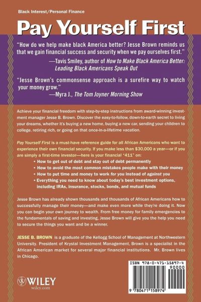 How do we help make black America better? Jesse Brown reminds us that we gain financial success and security when we pay ourselves first.-Tavis Smiley, author of How to Make Black America Better: Leading Black Americans Speak Out ""Jesse Brown's commonsense approach is a surefire way to watch your money grow.""-Myra J., The Tom Joyner Morning Show Achieve your financial freedom with step-by-step instructions from award-winning investment manager Jesse B. Brown. Discover the easy-to-follow, down-to-earth secret to living your dreams, whether it's buying a new home, buying a new car, sending your children to college, retiring rich, or going on that once-in-a-lifetime vacation. Pay Yourself First is a must-have reference guide for all African Americans who want to experience their own financial security. If you make less than $30,000 a year-or if you are simply a first-time investor-here is your financial ""411"" on: * How to get out of debt and stay out of debt permanently * How to avoid the most common mistakes people make with their money * How to put time and money to work for you instead of against you * Everything you need to know about today's best investment options, including IRAs, insurance, stocks, bonds, and mutual funds Jesse Brown has already shown thousands and thousands of African Americans how to successfully manage their money-and make even more while they're doing it. Now you can begin your own journey to wealth. From free money for family emergencies to the fundamentals of saving and investing, Jesse Brown will give you the help you need to secure the things you want and be a winner.