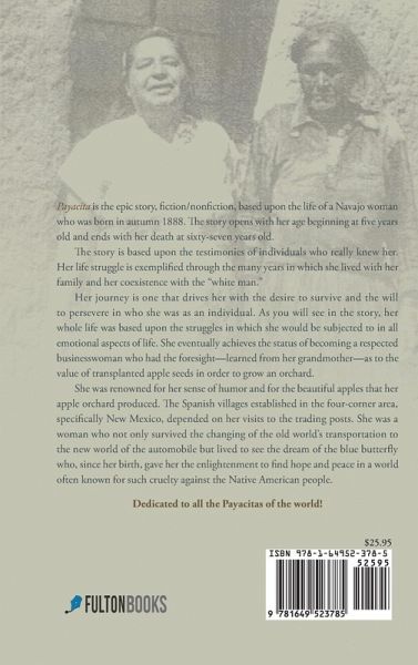 Payacita is the epic story, fiction/nonfiction, based upon the life of a Navajo woman who was born in autumn 1888. The story opens with her age beginning at five years old and ends with her death at sixty-seven years old. The story is based upon the testimonies of individuals who really knew her. Her life struggle is exemplified through the many years in which she lived with her family and her coexistence with the "white man." Her journey is one that drives her with the desire to survive and the will to persevere in who she was as an individual. As you will see in the story, her whole life was based upon the struggles in which she would be subjected to in all emotional aspects of life. She eventually achieves the status of becoming a respected businesswoman who had the foresight-learned from her grandmother-as to the value of transplanted apple seeds in order to grow an orchard. She was renowned for her sense of humor and for the beautiful apples that her apple orchard produced. The Spanish villages established in the four-corner area, specifically New Mexico, depended on her visits to the trading posts. She was a woman who not only survived the changing of the old world's transportation to the new world of the automobile but lived to see the dream of the blue butterfly who, since her birth, gave her the enlightenment to find hope and peace in a world often known for such cruelty against the Native American people. Dedicated to all the Payacitas of the world!