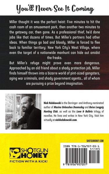Miller thought it was the perfect heist: Five minutes to hit the cash room of an amusement park, then another two minutes to the getaway car, then gone. As a professional thief, he'd done jobs like that dozens of times. But Miller's partners had other ideas. When things go bad and bloody, Miller is forced to flee back to familiar territory: New York City's West Village, where even the target of a nationwide manhunt can hide out amidst the freaks. But Miller's refuge might prove even more dangerous. Approached by an old friend about a shady protection job, Miller finds himself thrown into a bizarre world of pint-sized gangsters, aging war criminals, and shady government agents... all of whom are pursuing a prize beyond imagination. Early Praise "With PAYBACK IS FOREVER, Nick Kolakowski has crafted a quick, clever story that feels both classic and fresh. This one hits the ground running and never lets up. Highly recommend." -Steve Weddle, author Country Hardball "Like a demented fun-house mirror version of a Richard Stark novel, Kolakowski deconstructs hoary crime cliches with the sort of panache you don't want to miss. Our tour guide, Miller, is cut from the tough-guy mold, but twisted so askew by the end of the book, he's carved out his own niche." -Brian Asman, author of Man, F*ck This House