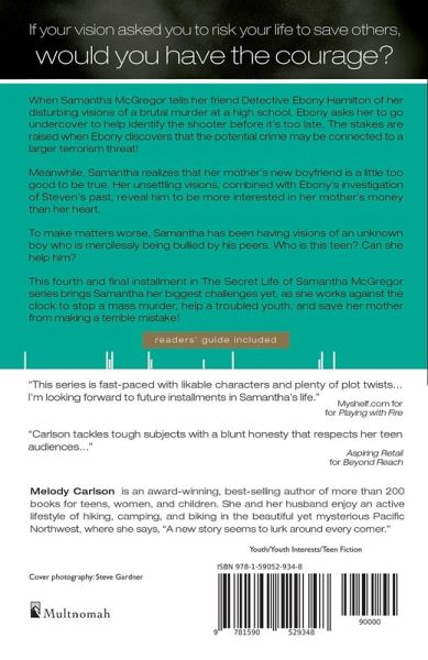 If your vision asked you to risk your life to save others, would you have the courage? When Samantha McGregor tells her friend Detective Ebony Hamilton of her disturbing visions of a brutal murder at a high school, Ebony asks her to go undercover to help identify the shooter before it's too late. The stakes are raised when Ebony discovers that the potential crime may be connected to a larger terrorism threat! Meanwhile, Samantha realizes that her mother's new boyfriend is a little too good to be true. Her unsettling visions, combined with Ebony's investigation of Steven's past, reveal him to be more interested in her mother's money than her heart. To make matters worse, Samantha has been having visions of an unknown boy who is mercilessly being bullied by his peers. Who is this teen? Can she help him? This fourth and final installment in The Secret Life of Samantha McGregor series brings Samantha her biggest challenges yet, as she works against the clock to stop a mass murder, help a troubled youth, and save her mother from making a terrible mistake!