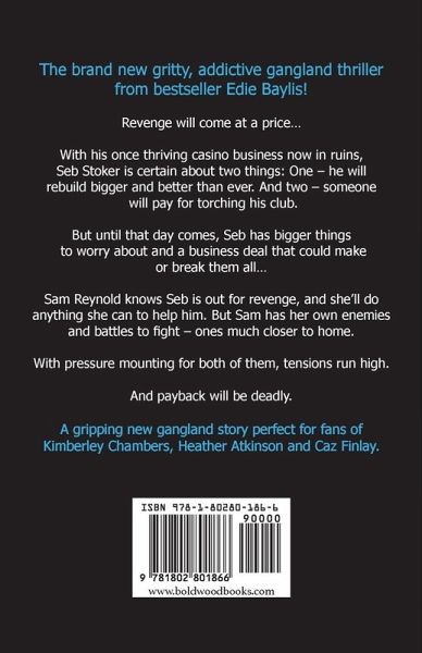 The brand new gritty, addictive gangland thriller from bestseller Edie Baylis! Revenge will come at a price... With his once thriving casino business now in ruins, Seb Stoker is certain about two things: One - he will rebuild bigger and better than ever. And two - someone will pay for torching his club. But until that day comes, Seb has bigger things to worry about and a business deal that could make or break them all... Sam Reynold knows Seb is out for revenge, and she'll do anything she can to help him. But Sam has her own enemies and battles to fight - ones much closer to home. With pressure mounting for both of them, tensions run high. And payback will be deadly. A gripping new gangland story perfect for fans of Kimberley Chambers, Heather Atkinson and Caz Finlay. What people are saying about Edie Baylis! 'From start to finish, fast paced and gripping. Gangland fiction at its best! Bestselling author Kerry Kaya. 'Shocking and thrilling at the same time. It will take your breath away!' Bestselling author Gillian Godden. 'Edie Baylis has produced another fantastic gangland read. I loved the characters and was gripped from the first page. A massive 5 stars!' Bestselling author Caz Finlay.