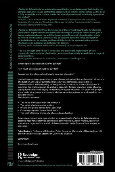Which type of education should we pay for? How much education should we pay for? Can we buy knowledge about how to improve education? Uniquely presenting a general overview of economic principles applicable to all sectors of education, Paying for Education makes key economic ideas accessible to non-economists, whilst drawing on insights from other social science disciplines. It examines the implications of its analysis, especially for two important areas of policy - paying for teachers and paying for teaching in higher education - in order to highlight some underlying issues and consider alternative policy options, as well as reflect on possible futures. The chapters examine: The value of education for the individual The value of education for society Private and public demands for education Choosing a system to supply education The cost, efficiency and equity of providing education Analysing evidence and case studies on a global scale, Paying for Education is an essential read for academics, educational administrators, policy makers, leaders in educational organisations and all of those interested in the future of how we pay for education.
