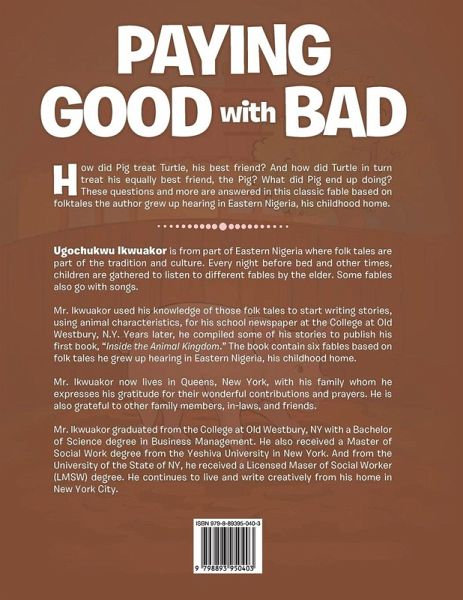 Ugochukwu Ikwuakor is from part of Eastern Nigeria where folk tales are part of the tradition and culture. Every night before bed and other times, children are gathered to listen to different fables by the elder. Some fables also go with songs. Mr. Ikwuakor used his knowledge of those folk tales to start writing stories, using animal characteristics, for his school newspaper at the College at Old Westbury, N.Y. Years later, he complied some of his stories to publish his first book, Inside the Animal Kingdom. The book contain six fables based on folk tales he grew up hearing in Eastern Nigeria, his childhood home. Mr. Ikwuakor now lives in Queens, New York, with his family whom he expresses his gratitude for their wonderful contributions and prayers. He is also grateful to other family members, in-laws, and friends. Mr. Ikwuakor graduated from the College at Old Westbury, NY with a Bachelor of Science degree in Business Management. He also received a Master of Social Work degree from the Yeshiva University in New York. And from the University of the State of NY, he received a Licensed Maser of Social Worker (LMSW) degree. He continues to live and write creatively from his home in New York City.