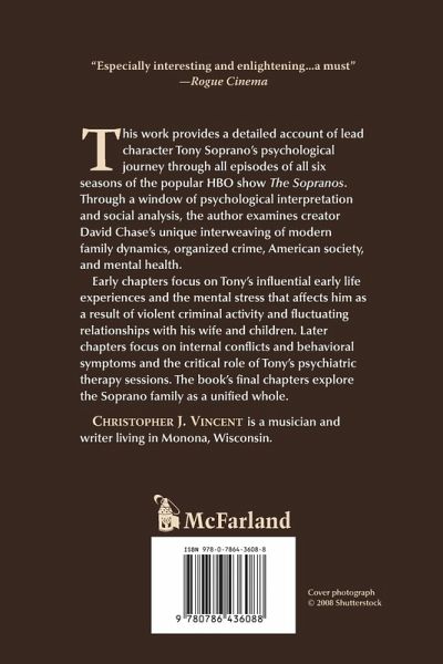This work provides a detailed account of lead character Tony Soprano's psychological journey through all episodes of all six seasons of the popular HBO show The Sopranos. Through a window of psychological interpretation and social analysis, the author examines creator David Chase's unique interweaving of modern family dynamics, organized crime, American society, and mental health. Early chapters focus on Tony's influential early life experiences and the mental stress that affects him as a result of violent criminal activity and fluctuating relationships with his wife and children. Later chapters focus on internal conflicts and behavioral symptoms and the critical role of Tony's psychiatric therapy sessions. The book's final chapters explore the Soprano family as a unified whole.