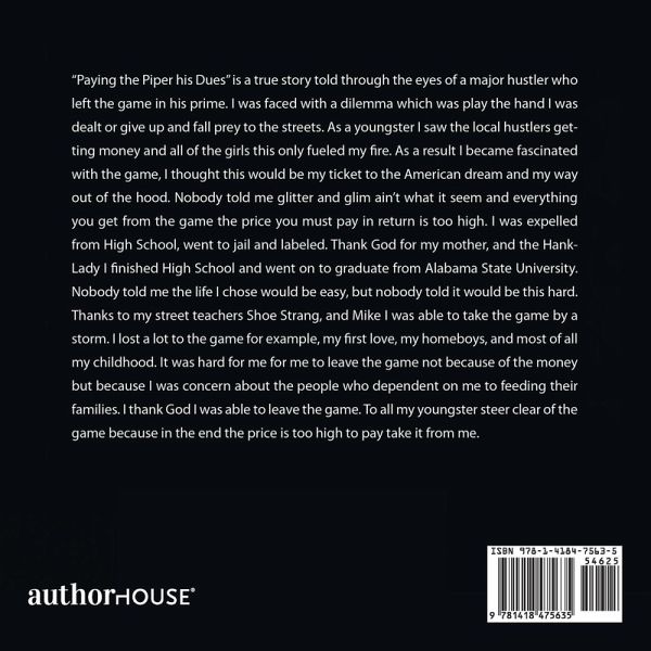 "Paying the Piper his Dues" is a true story told through the eyes of a major hustler who left the game in his prime. I was faced with a dilemma which was play the hand I was dealt or give up and fall prey to the streets. As a youngster I saw the local hustlers getting money and all of the girls this only fueled my fire. As a result I became fascinated with the game, I thought this would be my ticket to the American dream and my way out of the hood. Nobody told me glitter and glim ain't what it seem and everything you get from the game the price you must pay in return is too high. I was expelled from High School, went to jail and labeled. Thank God for my mother, and the Hank-Lady I finished High School and went on to graduate from Alabama State University. Nobody told me the life I chose would be easy, but nobody told it would be this hard. Thanks to my street teachers Shoe Strang, and Mike I was able to take the game by a storm. I lost a lot to the game for example, my first love, my homeboys, and most of all my childhood. It was hard for me for me to leave the game not because of the money but because I was concern about the people who dependent on me to feeding their families. I thank God I was able to leave the game. To all my youngster steer clear of the game because in the end the price is too high to pay take it from me.