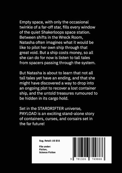 Empty space, with only the occasional twinkle of a far-off star, fills every window of the quiet Shakerloops space station. Between shifts in the Wreck Room, Natasha often imagines what it would be like to pilot her own ship through that great void. But a ship costs money, so all she can do for now is listen to tall tales from spacers passing through the system. But Natasha is about to learn that not all tall tales yet have an ending, and that she might have discovered a way to drop into an ongoing plot to recover a lost container ship, and the untold treasures rumoured to be hidden in its cargo hold. Set in the STARDRIFTER universe, PAYLOAD is an exciting stand-alone story of containers, curses, and corsairs set in the far future!