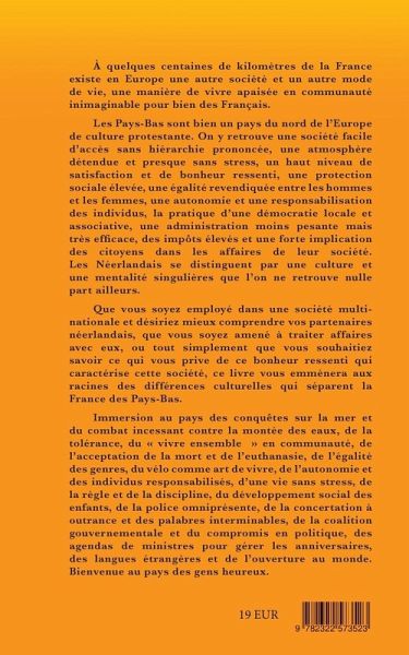A quelques centaines de kilomètres de la France existe en Europe une autre société et un autre mode de vie, une manière de vivre apaisée en communauté inimaginable pour bien des Français. Bienvenue au pays des gens heureux! Immersion au pays des conquêtes sur la mer et du combat incessant contre la montée des eaux, de la tolérance, du "vivre ensemble" en communauté que chaque habitant se doit de préserver, de l'acceptation de la mort et de l'euthanasie, de l'égalité des genres, du vélo comme art de vivre, de l'autonomie des individus responsabilisés, d'une vie sans stress et sans agressivité, de la règle et de la discipline, du développement social des jeunes, de la police omniprésente pour contrôler autant que pour protéger, de la concertation à outrance et des palabres interminables, de la coalition et du compromis, des agendas de ministres pour gérer les anniversaires, de la pratique des langues étrangères et de l'ouverture au monde. Au pays de la coalition et de l'esprit de compromis, de l'euthanasie et du "vivre ensemble", il faut y vivre pour le croire. Que vous soyez résident et désireux de mieux comprendre vos partenaires néerlandais, que vous soyez amené à traiter affaires avec eux, ou tout simplement que vous aimeriez savoir ce qui vous prive de ce bonheur ressenti qui caractérise cette société, ce livre vous emmènera aux racines des différences culturelles qui séparent la France des Pays-Bas.