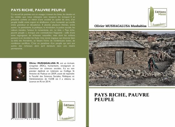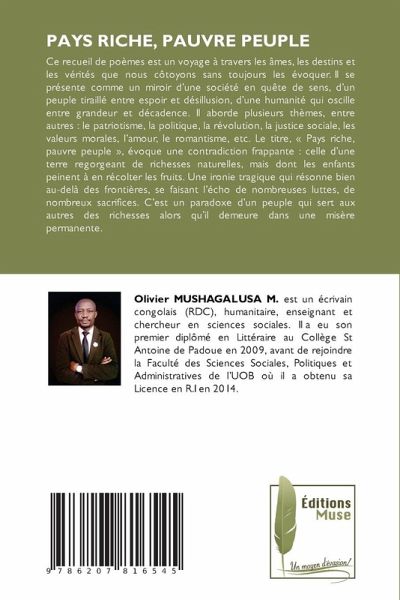 Ce recueil de poèmes est un voyage à travers les âmes, les destins et les vérités que nous côtoyons sans toujours les évoquer. Il se présente comme un miroir d'une société en quête de sens, d'un peuple tiraillé entre espoir et désillusion, d'une humanité qui oscille entre grandeur et décadence. Il aborde plusieurs thèmes, entre autres : le patriotisme, la politique, la révolution, la justice sociale, les valeurs morales, l'amour, le romantisme, etc. Le titre, « Pays riche, pauvre peuple », évoque une contradiction frappante : celle d'une terre regorgeant de richesses naturelles, mais dont les enfants peinent à en récolter les fruits. Une ironie tragique qui résonne bien au-delà des frontières, se faisant l'écho de nombreuses luttes, de nombreux sacrifices. C'est un paradoxe d'un peuple qui sert aux autres des richesses alors qu'il demeure dans une misère permanente.