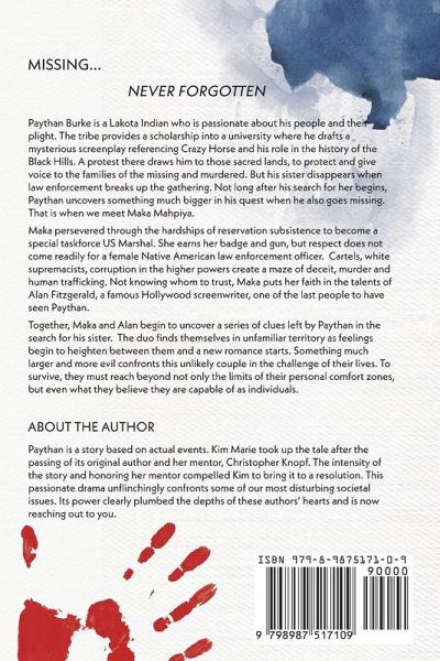 Paythan Burke is a Lakota Indian who is passionate about his people and their plight. The tribe provides a scholarship into a university where he drafts a mysterious screenplay referencing Crazy Horse and his role in the history of the Black Hills. A protest there draws him to those sacred lands, to protect and give voice to the families of the missing and murdered. But his sister disappears when law enforcement breaks up the gathering. Not long after his search for her begins, Paythan uncovers something much bigger in his quest when he also goes missing. That is when we meet Maka Mahpiya. Maka persevered through the hardships of reservation subsistence to become a special taskforce US Marshal. She earns her badge and gun, but respect does not come readily for a female Native American law enforcement officer. Cartels, white supremacists, corruption in the higher powers create a maze of deceit, murder and human trafficking. Not knowing whom to trust, Maka puts her faith in the talents of Alan Fitzgerald, a famous Hollywood screenwriter, one of the last people to have seen Paythan. Together, Maka and Alan begin to uncover a series of clues left by Paythan in the search for his sister. The duo finds themselves in unfamiliar territory as feelings begin to heighten between them and a new romance starts. Something much larger and more evil confronts this unlikely couple in the challenge of their lives. To survive, they must reach beyond not only the limits of their personal comfort zones, but even what they believe they are capable of as individuals. Paythan is a story based on actual events. Kim Marie took up the tale after the passing of its original author and her mentor, Christopher Knopf. The intensity of the story and honoring her mentor compelled Kim to bring it to a resolution. This passionate drama unflinchingly confronts some of our most disturbing societal issues. Its power clearly plumbed the depths of these authors' hearts and is now reaching out to you.