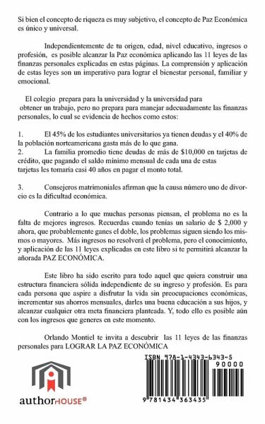 Si bien el concepto de riqueza es muy subjetivo, el concepto de Paz Económica es único y universal. Independientemente de tu origen, edad, nivel educativo, ingresos o profesión, es posible alcanzar la Paz económica aplicando las 11 leyes de las finanzas personales explicadas en estas páginas. La comprensión y aplicación de estas leyes son un imperativo para lograr el bienestar personal, familiar y emocional. El colegio prepara para la universidad y la universidad para obtener un trabajo, pero no prepara para manejar adecuadamente las finanzas personales, lo cual se evidencia de hechos como estos: 1. El 45% de los estudiantes universitarios ya tienen deudas y el 40% de la población norteamericana gasta más de lo que gana. 2. La familia promedio tiene deudas de más de $10,000 en tarjetas de crédito, que pagando el saldo mínimo mensual de cada una de estas tarjetas les tomaría casi 40 años en pagar el monto total. 3. Consejeros matrimoniales afirman que la causa número uno de divorcio es la dificultad económica. Contrario a lo que muchas personas piensan, el problema no es la falta de mejores ingresos. Recuerdas cuando tenías un salario de $ 2,000 y ahora, que probablemente ganes el doble, los problemas siguen siendo los mismos o mayores. Más ingresos no resolverá el problema, pero el conocimiento, y aplicación de las 11 leyes explicadas en este libro si te permitirá alcanzar la añorada PAZ ECONÓMICA. Este libro ha sido escrito para todo aquel que quiera construir una estructura financiera sólida independiente de su ingreso y profesión. Es para cada persona que aspire a disfrutar la vida sin preocupaciones económicas, incrementar sus ahorros mensuales, darles una buena educación a sus hijos, y alcanzar cualquier otra meta financiera planteada. Y, todo ello es posible aún con los ingresos que generes en este momento. Orlando Montiel te invita a descubrir las 11 leyes de las finanzas personales para LOGRAR LA PAZ ECONÓMICA