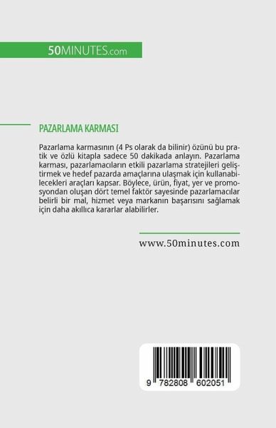 Pazarlama karmas¿n¿n (4 Ps olarak da bilinir) özünü bu pratik ve özlü kitapla sadece 50 dakikada anlay¿n. Pazarlama karmas¿, pazarlamac¿lar¿n etkili pazarlama stratejileri geli¿tirmek ve hedef pazarda amaçlar¿na ulämak için kullanabilecekleri araçlar¿ kapsar. Böylece, ürün, fiyat, yer ve promosyondan olu¿an dört temel faktör sayesinde pazarlamac¿lar belirli bir mal, hizmet veya markan¿n bäar¿s¿n¿ sälamak için daha ak¿ll¿ca kararlar alabilirler. Bu kitap size pazarlama karmas¿n¿n her bir bile¿enine kullan¿¿l¿ bir giri¿ ve stratejik planlamaya nas¿l uygulanacä¿na dair net tavsiyeler sunmaktad¿r. Ayr¿ca çe¿itli vaka çal¿¿malar¿, potansiyel tuzaklara ili¿kin bir tart¿¿ma ve 7 Ps ve 4 C gibi ilgili modellere bir giri¿ içermektedir. Pazarlama karmas¿ hakk¿nda : Pazarlama karmas¿, bir ¿irketin sat¿¿lar¿n¿ art¿rmak için elindeki tüm araçlar¿ bir araya getirir. Kendine özgü ""4 Ps"", kullan¿c¿lar¿n hedef pazardaki tüketicileri çekmek için ürün politikas¿, fiyatland¿rma politikas¿, dä¿t¿m politikas¿ ve ileti¿im politikas¿ hakk¿nda bilinçli kararlar almas¿na olanak tan¿r. Kapsaml¿ ancak uygulamas¿ kolay olan bu model, i¿letme okullar¿nda yayg¿n olarak ö¿retilmekte ve uygulamada da yayg¿n olarak kullan¿lmaktad¿r. Bu kitapta, pazarlama karmas¿n¿n size nas¿l yard¿mc¿ olabilece¿ini, dört kategorinin her birinde önemli kararlar¿ nas¿l alacä¿n¿z¿ ve pazarlama stratejinizi test etmek için bu yaklä¿m¿ nas¿l kullanacä¿n¿z¿ ke¿fedeceksiniz. Yöntemin avantajlar¿n¿n ve olas¿ dezavantajlar¿n¿n net bir ¿ekilde aç¿klanmas¿, çe¿itli vaka çal¿¿malar¿n¿n tart¿¿¿lmas¿ ve ilgili modellere giri¿ yap¿lmas¿, yaklä¿m¿n¿z¿ durumunuza göre uyarlaman¿z için gereken araçlar¿ sälar.