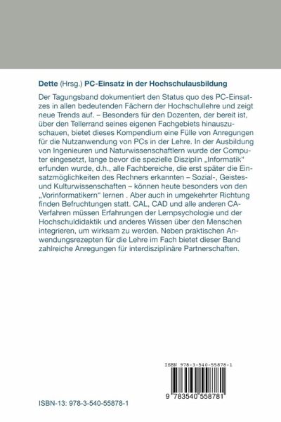 Der Tagungsband dokumentiert den Status quo des PC-Einsatzes in allen bedeutenden Fächern der Hochschullehre und zeigt neue Trends auf. - Besonders für den Dozenten, der bereit ist, über den Tellerrand seines eigenen Fachgebiets hinauszuschauen, bietet dieses Kompendium eine Fälle von Anregungen für die Nutzanwendung von PCs in der Lehre. In der Ausbildung von Ingenieuren und Naturwissenschaftlern wurde der Computer eingesetzt, lange bevor die spezielle Disziplin "Informatik" erfunden wurde,d.h., dass alle Fachbereiche, die erst später die Einsatzmöglichkeiten des Rechners erkannten - Sozial-, Geistes- und Kulturwissenschaften, - heute besonders von den "Vorinformatikern" lernen k nnen. Aber auch in umgekehrter Richtung finden Befruchtungen statt. CAL, CAD und alle anderen CA-Verfahren müssen Erfahrungen der Lernpsychologie und der Hochschuldikaktik und anderes Wissen über den Menschen integrieren, um wirksam zu werden. Die alte Idee der "universitas", die durch jahrzehntelange Differenzierungen in den Disziplinen zu versinken droht und