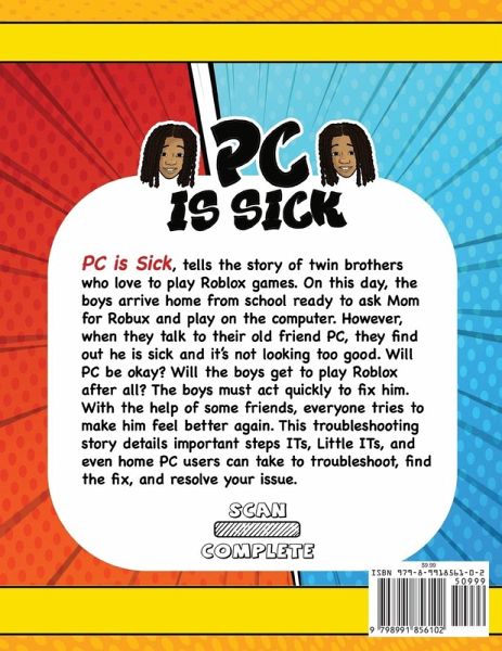 PC is Sick, tells the story of twin brothers who love to play Roblox games. On this day, the boys arrive home from school ready to ask Mom for Robux, $$$, and play on the computer. However, when they talk to their old friend PC, they find out he is sick and it's not looking too good. Will PC be okay? Will the boys get to play Roblox after all? The boys must act quickly to fix him. With the help of some friends, everyone tries to make him feel better again. This troubleshooting story details the important steps ITs, Little ITs, and even home PC users can take to troubleshoot, find the fix, and resolve your issue.