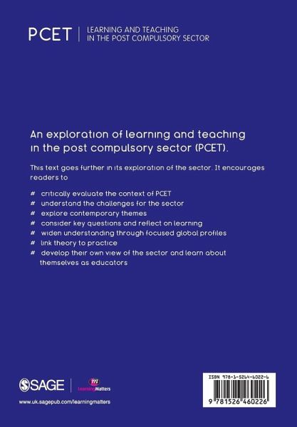 The text explores learners in the sector, the diversity of the sector, the challenges and some topical contemporary themes. It covers a breadth of content and can thus be used as a general course text for all PGCE (PCET) courses as well as other education programmes. Through pedagogical features including critical questions, teacher and learner voices, links to practice and more, the text provides a resource for all those learning about PCET.