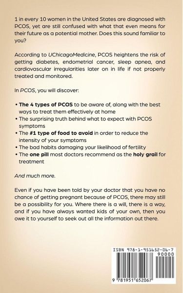 1 in every 10 women in the United States are diagnosed with PCOS, yet are still confused with what that even means for their future as a potential mother. Does this sound familiar to you? Many women hear the term "PCOS," but may not know exactly what it stands for, nor what it is. PCOS is short for Polycystic Ovary Syndrome, and it is a common hormonal disorder among women between the ages of 20 and 45 years. Although common, the symptoms that coincide with the condition can be quite bothersome, and may include: Weight gain Excessive hair growth, typically on the face, chest, or back regions Irregular periods, or even absence of periods Hair loss from the scalp Mood swings Difficulties getting pregnant According to UChicagoMedicine, PCOS heightens the risk of getting diabetes, endometrial cancer, sleep apnea, and cardiovascular irregularities later on in life if not properly treated and monitored. All hope is not lost though, so don't give up just yet! There is always an answer for everything, no matter how many times you feel like you're circling around the same issue. In PCOS, you will discover: The 4 types of PCOS to be aware of, along with the best ways to treat them effectively at home The surprising truth behind what to expect with PCOS symptoms The #1 type of food to avoid in order to reduce the intensity of your symptoms How the food you consume can either harm or help your recovery from the disorder, as well as what they are Which natural healing agents are effective for the treatment Why becoming pregnant while having PCOS isn't impossible and how to increase your chances The bad habits damaging your likelihood of fertility The one pill most doctors recommend as the holy grail for treatment And much more. Even if you have been told by your doctor that you have no chance of getting pregnant because of PCOS, there may still be a possibility for you. Where there is a will, there is a way, and if you have always wanted kids of your own, then you owe it to yourself to seek out all the information out there. There are many misconceptions about the condition, often confusing both doctors as well as their patients, but now is the time to put your foot down and demand an explanation. It may not even be the pregnancy issue that concerns you the most, but the frustrating weight fluctuations and constant acne. You may be thinking, "Why me? I don't want to deal with this right now like you said, the condition in itself is not fatal," and then box it up and shove it onto the subconscious shelf labeled: "I'll do it later." Putting off medical conditions for a later time often has a way of creeping back into your life, usually having evolved into something much more significant than when it had just started out. Do yourself a favor: get down to the bottom of your troublesome condition, and finally, let go of your persistent worry and aggravation. If you want to discover how you can break free from the grasp of PCOS and its burdens, and open up the option of starting a family of your own, then you should get this book today!