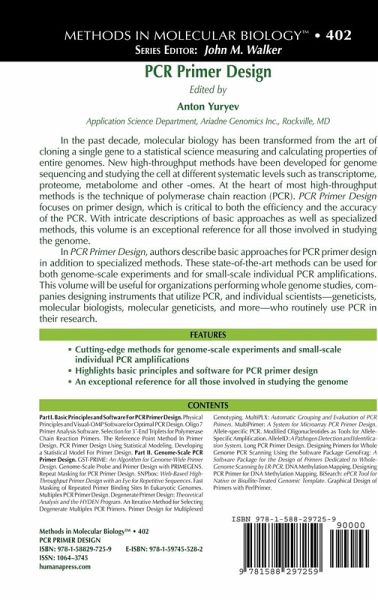 In PCR Primer Design, authors describe basic approaches for PCR primer design in addition to specialized methods. These state-of-the-art methods can be used for both genome-scale experiments and for small-scale individual PCR amplifications. This volume will be useful for organizations performing whole genome studies, companies designing instruments that utilize PCR, and individual scientists - geneticists, molecular biologists, molecular geneticists, and more - who routinely use PCR in their research.