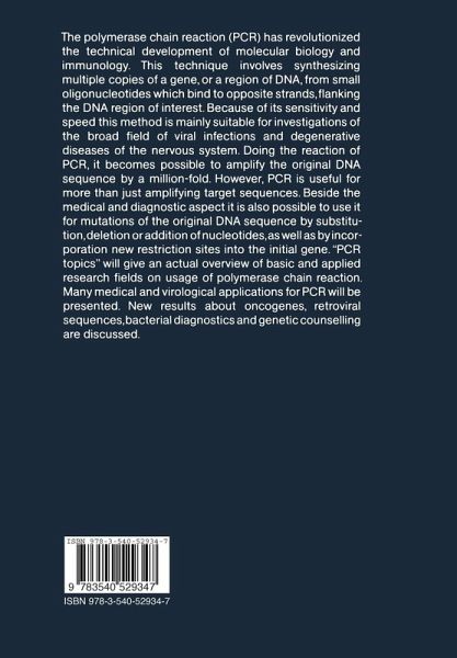 PCR, developed at Cetus Corporation/USA by Henry A. Erlich, Kary Mullis and Randall K. Saiki, is a very simple method for amplifying nucleic acids in vitro. The realization of this idea bases on the repetition of a set of three different temperatures and yields an increase of the target structure up to a factor of 106 to 1012. Therefore, this technique is predisposed for safe analysis and characterization of DNA and RNA sequences of interest, even where the starting amount of material is enormously small. Because of its sensitivity, speed and versatility this method is particularly suitable for investigations of oncogenes, tumor associated translocations, retroviral sequences, lymphokines and mainly the broad field of degenerative and inflammatory diseases of nervous system. PCR seems to be the technique which could overcome the two most important problems in that field: very small amount of material combined with the necessity of rapid diagnostic procedures in inflammatory infections. "PCR topics" will give an actual overview of basic and applied research fields on usage of polymerase chain reaction. All contributions to this book have been presented at an international congress on "Usage of Polymerase chain reaction in genetic and infectious diseases" which took place in june 1990 in Berlin. The editors wish to thank all participants for their contributions. We offer our thanks and gratitude to our coworkers and especially to our technical assistents Barbara Trampenau, Mirjana Wiirdemann and Hannelore Leonhard.