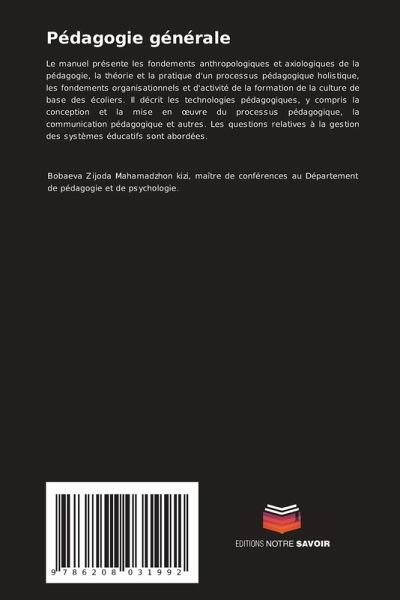 Le manuel présente les fondements anthropologiques et axiologiques de la pédagogie, la théorie et la pratique d'un processus pédagogique holistique, les fondements organisationnels et d'activité de la formation de la culture de base des écoliers. Il décrit les technologies pédagogiques, y compris la conception et la mise en oeuvre du processus pédagogique, la communication pédagogique et autres. Les questions relatives à la gestion des systèmes éducatifs sont abordées.
