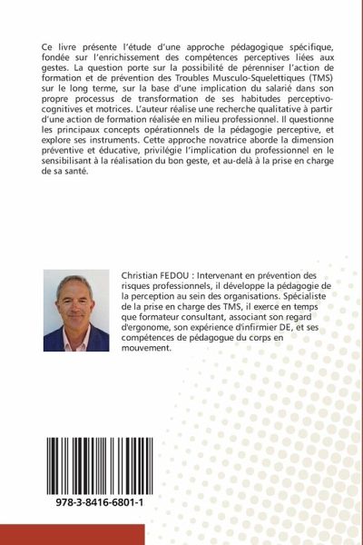 Ce livre présente l'étude d'une approche pédagogique spécifique, fondée sur l'enrichissement des compétences perceptives liées aux gestes. La question porte sur la possibilité de pérenniser l'action de formation et de prévention des Troubles Musculo-Squelettiques (TMS) sur le long terme, sur la base d'une implication du salarié dans son propre processus de transformation de ses habitudes perceptivo-cognitives et motrices. L'auteur réalise une recherche qualitative à partir d'une action de formation réalisée en milieu professionnel. Il questionne les principaux concepts opérationnels de la pédagogie perceptive, et explore ses instruments. Cette approche novatrice aborde la dimension préventive et éducative, privilégie l'implication du professionnel en le sensibilisant à la réalisation du bon geste, et au-delà à la prise en charge de sa santé.
