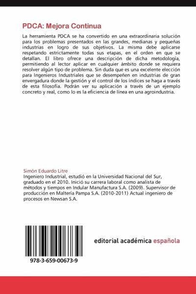 La herramienta PDCA se ha convertido en una extraordinaria solución para los problemas presentados en las grandes, medianas y pequeñas industrias en logro de sus objetivos. La misma debe aplicarse respetando estrictamente todas sus etapas, en el orden en que se detallan. El libro ofrece una descripción de dicha metodología, permitiendo al lector aplicar en cualquier ámbito donde se requiera resolver algún tipo de problema. Sin duda que es una excelente elección para Ingenieros Industriales que se desempeñen en industrias de gran envergadura donde la gestión y el control de los índices se haga a través de esta filosofía. Podrán ver su aplicación a través de un ejemplo concreto y real, como lo es la eficiencia de línea en una agroindustria.