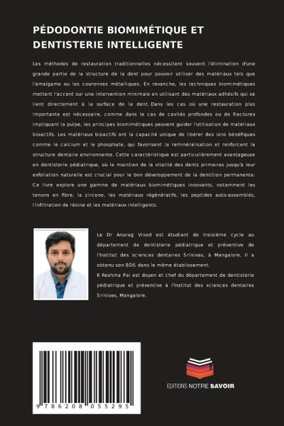 Les méthodes de restauration traditionnelles nécessitent souvent l'élimination d'une grande partie de la structure de la dent pour pouvoir utiliser des matériaux tels que l'amalgame ou les couronnes métalliques. En revanche, les techniques biomimétiques mettent l'accent sur une intervention minimale en utilisant des matériaux adhésifs qui se lient directement à la surface de la dent. Dans les cas où une restauration plus importante est nécessaire, comme dans le cas de cavités profondes ou de fractures impliquant la pulpe, les principes biomimétiques peuvent guider l'utilisation de matériaux bioactifs. Les matériaux bioactifs ont la capacité unique de libérer des ions bénéfiques comme le calcium et le phosphate, qui favorisent la reminéralisation et renforcent la structure dentaire environnante. Cette caractéristique est particulièrement avantageuse en dentisterie pédiatrique, où le maintien de la vitalité des dents primaires jusqu'à leur exfoliation naturelle est crucial pour le bon développement de la dentition permanente. Ce livre explore une gamme de matériaux biomimétiques innovants, notamment les tenons en fibre, la zircone, les matériaux régénératifs, les peptides auto-assemblés, l'infiltration de résine et les matériaux intelligents.