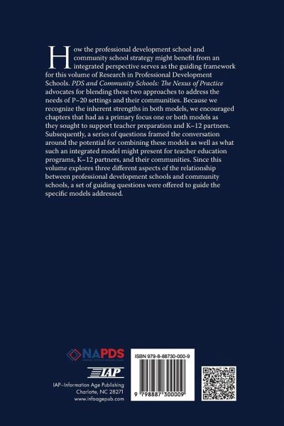 How the Professional Development School and Community School strategy might benefit from an integrated perspective serves as the guiding framework for this volume of Research in Professional Development Schools. This book advocates for blending these two approaches to address the needs of P-20 settings and their communities. Because we recognize the inherent strengths in both models, we encouraged chapters that had as a primary focus one or both models as they sought to support teacher preparation and K-12 partners. Subsequently, a series of questions framed the conversation around the potential for combining these models as well as what such an integrated model might present for teacher education programs, K-12 partners, and their communities. Since this volume explores three different aspects of the relationship between Professional Development Schools and Community Schools, a set of guiding questions were offered to guide the specific models addressed.