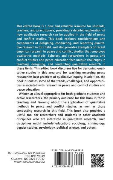 A volume in Peace Education Series Editors Jing Lin, University of Maryland, Edward Brantmeier, James Madison University, and Ian Harris, University of Wisconsin, Milwaukee This edited book is a new and valuable resource for students, teachers, and practitioners, providing a detailed exploration of how qualitative research can be applied in the field of peace and conflict studies. This book explores considerations and components of designing, conducting, and reporting qualitative research in this field, and also provide exemplars of recent empirical research in peace and conflict studies that employed qualitative methods. Scholars and researchers in peace and conflict studies and peace education face unique challenges in teaching, designing, and conducting qualitative research in these fields. This edited book discusses tips in designing qualitative studies in this area and for teaching emerging peace researchers best practices of qualitative inquiry. In addition, the book discusses some of the trends, challenges, and opportunities associated with research in peace and conflict studies and peace education. Written at a level appropriate for both graduate students and active researchers, the primary audience for this book is those teaching and learning about the application of qualitative methods to peace and conflict studies, as well as those conducting research in this field. There are currently approximately 230 graduate programs in peace and conflict studies. This book also provides a useful tool for researchers and students in other academic disciplines who are interested in qualitative research. Such disciplines might include education, sociology, criminology, gender studies, psychology, political science, and others.