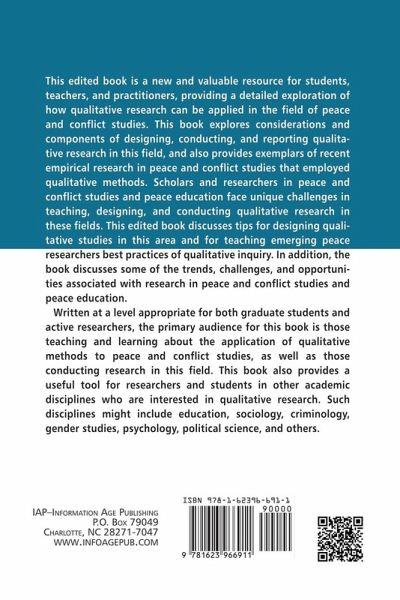 A volume in Peace Education Series Editors Jing Lin, University of Maryland, Edward Brantmeier, James Madison University, and Ian Harris, University of Wisconsin, Milwaukee This edited book is a new and valuable resource for students, teachers, and practitioners, providing a detailed exploration of how qualitative research can be applied in the field of peace and conflict studies. This book explores considerations and components of designing, conducting, and reporting qualitative research in this field, and also provide exemplars of recent empirical research in peace and conflict studies that employed qualitative methods. Scholars and researchers in peace and conflict studies and peace education face unique challenges in teaching, designing, and conducting qualitative research in these fields. This edited book discusses tips in designing qualitative studies in this area and for teaching emerging peace researchers best practices of qualitative inquiry. In addition, the book discusses some of the trends, challenges, and opportunities associated with research in peace and conflict studies and peace education. Written at a level appropriate for both graduate students and active researchers, the primary audience for this book is those teaching and learning about the application of qualitative methods to peace and conflict studies, as well as those conducting research in this field. There are currently approximately 230 graduate programs in peace and conflict studies. This book also provides a useful tool for researchers and students in other academic disciplines who are interested in qualitative research. Such disciplines might include education, sociology, criminology, gender studies, psychology, political science, and others.