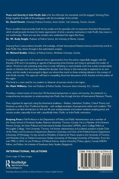 Peace and Security in Indo-Pacific Asia is for the informed, the interested, and the engaged. Sorpong Peou brings together the skills of the pedagogue with the knowledge of the scholar. -Dr. David Dewitt, University Professor Emeritus, Senior Scholar, York University, Toronto, Canada. Peou's excellent book provides both the lay reader and the specialist with six important theoretical frameworks which should provide the basis for better appreciation of what a security community in Indo-Pacific Asia means in our world today. There are very few scholars who understand the region like Peou. -Dr. W. Andy Knight, Professor of Political Science, the University of Alberta, Canada. Sorpong Peou's extraordinary breadth of knowledge, of both International Relations theory and the key trends in Indo-Pacific Asia, shines through in this authoritative analysis. -Dr. Richard Stubbs, Professor of Political Science, McMaster University, Canada. A pedagogical approach of the textbook that is appreciated is how the author respectfully engages with the theories of IR and is not pushing an agenda of denouncing some theories and trying to persuade the reader of others. We live in such polarizing times that it is truly refreshing to read scholarly work that avoids sensationalistic attacks on theories that have been debated for decades. Each theory in this manuscript is explored on its own terms, and the reader is encouraged to figure out where they stand on these enduring debates in the context of Indo-Pacific security. The approach will lead to compelling classroom discussions of the theories and the politics of the region. This book is a must-read for any student or observer of security trends in the region. -Dr. Mark Williams, Chair and Professor of Political Studies, Vancouver Island University, B.C., Canada.
