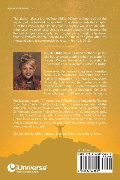 The author takes a journey into biblical history to inquire about the mystery of the beloved disciple John. She strongly feels that chapter 21 of the Gospel of John implies that the disciple would not die. After thirty-seven years of research, she discovers a book, The Secret of the Beloved Disciple, by author James F. Twyman, which confirms her belief that the beloved disciple John still lives on the earth's plane after two thousand years as commanded by Jesus in John 21: 20-23.