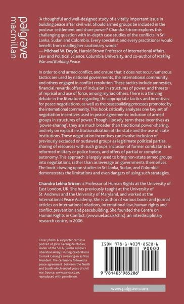 'A thoughtful and well-designed study of a vitally important issue in building a peace after civil war. Should armed groups be included in the postwar settlement and share power? Chandra Sriram explores this challenging question with in-depth case studies of the conflicts in Sri Lanka, Sudan and Colombia. Every specialist and every practitioner would benefit from reading her cautionary words.' - Michael W. Doyle, Harold Brown Professor of International Affairs, Law and Political Science, Columbia University, and co-author of Making War and Building Peace