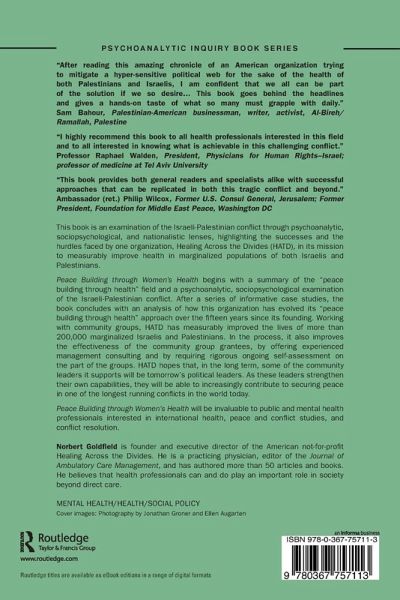 This book is an examination of the Israeli-Palestinian conflict through psychoanalytic, sociopsychological, and nationalistic lenses, highlighting the successes and the hurdles faced by one organization, Healing Across the Divides (HATD), in its mission to measurably improve health in marginalized populations of both Israelis and Palestinians. Peace Building through Women's Health begins with a summary of the "peace building through health" field and a psychoanalytic, sociopsychological examination of the Israeli-Palestinian conflict. After a series of informative case studies, the book concludes with an analysis of how this organization has evolved its "peace building through health" approach over the fifteen years since its founding. Working with community groups, HATD has measurably improved the lives of more than 200,000 marginalized Israelis and Palestinians. In the process, it also improves the effectiveness of the community group grantees, by offering experienced management consulting and by requiring rigorous ongoing self-assessment on the part of the groups. IHATD hopes that, in the long term, some of the community leaders it supports will be tomorrow's political leaders. As these leaders strengthen their own capabilities, they will be able to increasingly contribute to securing peace in one of the longest running conflicts in the world today. Peace Building through Women's Health will be invaluable to public and mental health professionals interested in international health, peace and conflict studies, and conflict resolution.