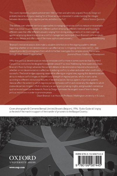 Why does political decentralization seem reduce intrastate conflict more in some countries than in others? This question constitutes the central focus of Peace by Design. Brancati argues that the ability of decentralization to reduce intrastate conflict hinges on the electoral strength of regional parties. According to Brancati, regional parties tend to promote intrastate conflict by creating regional identities, advocating legislation harmful to other regions and regional minorities, and mobilizing groups to engage in conflict or supporting extremist organizations that do. Brancati also highlights a number of conditions under which regional parties are more likely to promote conflict, such as democratic transitions. Brancati further argues that decentralization increases the strength of regional parties depending on particular features of decentralization (i.e., the proportion of legislative seats a region possesses, the number of regional legislatures in a country, the upper house election procedures, the sequencing of national and regional elections). These features of decentralization vary across countries and are fundamental to explaining why decentralization is not effective in reducing conflict in all countries. Brancati's ultimate conclusion is that decentralization can be effectively designed to promote peace, as long as it is designed to encourage statewide parties to incorporate regional parties into their agendas and to limit the strength of regional parties. The author provides compelling evidence for her argument through three detailed cases studies (e.g., Czechoslovakia, Spain, and India) and a rigorous quantitative analysis in which she introduces a new dataset on constituency-level elections that will prove an invaluable resource for many future studies.
