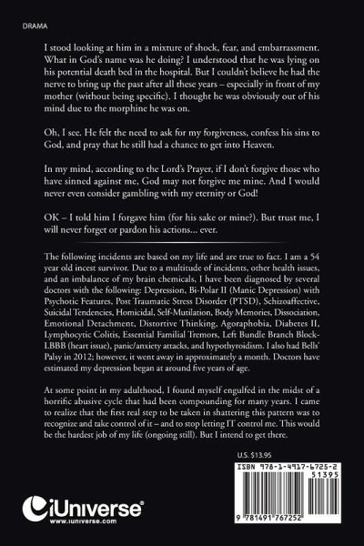 How does a child fight the devil? Tessa's father began coming in her bedroom during a time when she should have been focused on toys instead of on shielding herself from a predator. Despite her attempts to keep him out, nothing would deter him. The man who was supposed to provide for and protect her as a child took her innocence and changed her forever. Through essays and poetry, Tessa reveals a heartbreaking glimpse into the life of a sexual abuse victim as she did everything in her power to survive her personal hell. While sharing how she became a good pretender who wore many different masks, Tessa describes a horrifying cycle of rapes-not just from her father-but by other family members as well. As she matured and attempted to work through the aftereffects of the abuse, Tessa discloses how she finally came to realize that the only way she could ever move forward into healing was to recognize and take control of the abuse-and stop letting it control her. Through faith, inner-strength, and a determination to live, Tessa proves the incredible power of the human will to survive. Peace by Piece shares the true story of an incest survivor as she learns to take charge of her destiny, keep the faith, and somehow endure her battle with the devil.