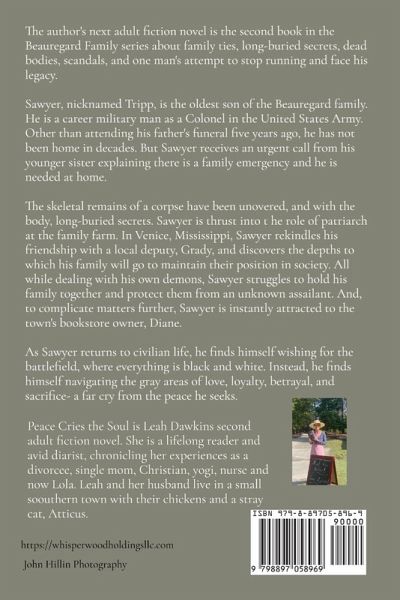 The author's next adult fiction novel is the second book in the Beauregard Family series about family ties, long-buried secrets, dead bodies, scandals, and one man's attempt to stop running and face his legacy. Sawyer, nicknamed Tripp, is the oldest son of the Beauregard family. He is a career military man as a Colonel in the United States Army. Other than attending his father's funeral five years ago, he has not been home in decades. But Sawyer receives an urgent call from his younger sister explaining that there is a family emergency and he is needed at home. The skeletal remains of a corpse have been uncovered, and with the body, long-buried secrets. Sawyer is thrust into the role of patriarch at the family farm. In Venice, Mississippi, Sawyer rekindles his friendship with a local deputy, Grady, and discovers the depths to which his family will go to maintain their position in society. All while dealing with his own demons, Sawyer struggles to hold his family together and protect them from an unknown assailant. And, to complicate matters further, Sawyer is instantly attracted to the town's bookstore owner, Diane. As Sawyer returns to civilian life, he finds himself wishing for the battlefield, where everything is black and white. Instead, he finds himself navigating the gray areas of love, loyalty, betrayal, and sacrifice-a far cry from the peace he seeks.