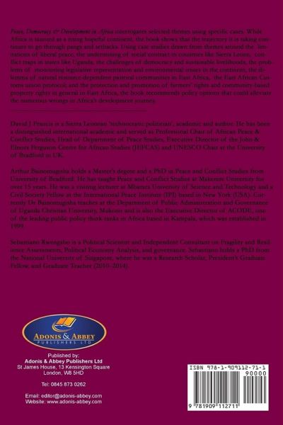 Peace, Democracy & Development in Africa interrogates selected themes using specific cases. While Africa is taunted as a rising hopeful continent, the book shows that the trajectory it is taking continues to go through pangs and setbacks. Using case studies drawn from themes around the limitations of liberal peace, the undermining of social contract in countries like Sierra Leone, conflict traps in states like Uganda, the challenges of democracy and sustainable livelihoods, the problems of monitoring legislative representation and environmental issues in the continent, the dilemma of natural resource-dependent pastoral communities in East Africa, the East African Customs union protocol; and the protection and promotion of farmers' rights and community-based property rights in general in East Africa, the book recommends policy options that could alleviate the numerous wrongs in Africa's development journey. ________________________________________ David J Francis is a Sierra Leonean 'technocratic politician', academic and author. He has been a distinguished international academic and served as Professorial Chair of African Peace & Conflict Studies, Head of Department of Peace Studies, Executive Director of the John & Elnora Ferguson Centre for African Studies (JEFCAS) and UNESCO Chair at the University of Bradford in UK. Arthur Bainomugisha holds a Master's degree and a PhD in Peace and Conflict Studies from University of Bradford. He has taught Peace and Conflict Studies at Makerere University for over 15 years. He was a visiting lecturer at Mbarara University of Science and Technology and a Civil Society Fellow at the International Peace Institute (IPI) based in New York (USA). Currently Dr Bainomugisha teaches at the Department of Public Administration and Governance of Uganda Christian University, Mukono and is also the Executive Director of ACODE, one of the leading public policy think-tanks in Africa based in Kampala, which was established in 1999. Sebastiano Rwengabo is a Political Scientist and Independent Consultant on Fragility and Resilience Assessments, Political Economy Analysis, and governance. Sebastiano holds a PhD from the National University of Singapore, where he was a Research Scholar, President's Graduate Fellow, and Graduate Teacher (2010-2014).