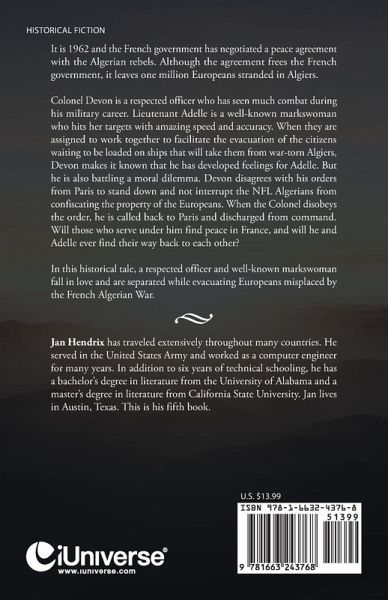 It is 1962 and the French government has negotiated a peace agreement with the Algerian rebels. Although the agreement frees the French government, it leaves one million Europeans stranded in Algiers. Colonel Devon is a respected officer who has seen much combat during his military career. Lieutenant Adelle is a well-known markswoman who hits her targets with amazing speed and accuracy. When they are assigned to work together to facilitate the evacuation of the citizens waiting to be loaded on ships that will take them from war-torn Algiers, Devon makes it known that he has developed feelings for Adelle. But he is also battling a moral dilemma. Devon disagrees with his orders from Paris to stand down and not interrupt the NFL Algerians from confiscating the property of the Europeans. When the Colonel disobeys the order, he is called back to Paris and discharged from command. Will those who serve under him find peace in France, and will he and Adelle ever find their way back to each other? In this historical tale, a respected officer and well-known markswoman fall in love and are separated while evacuating Europeans misplaced by the French Algerian War.